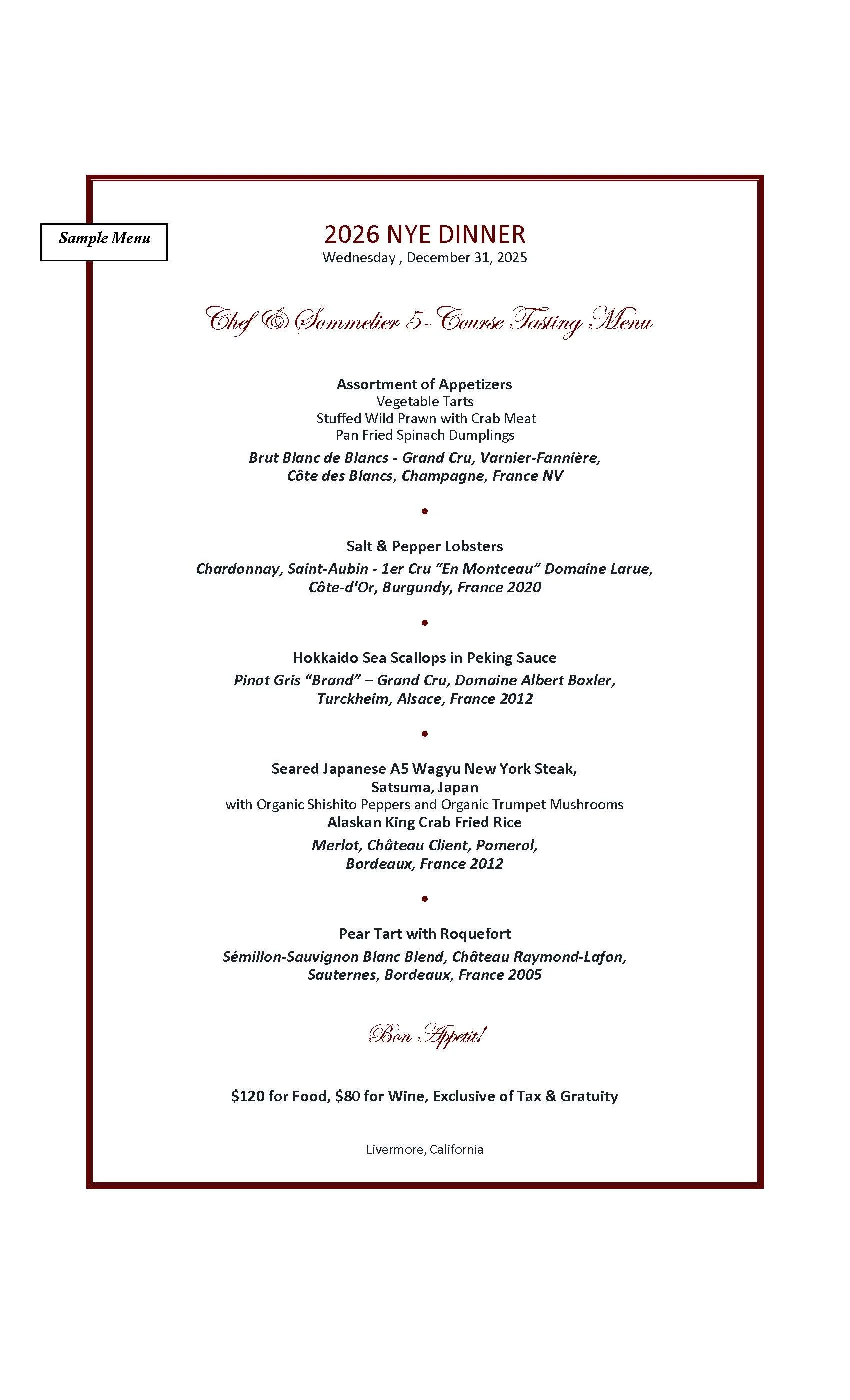 5-Course Chef-Sommelier Tasting Menu Food $120, Wine $80